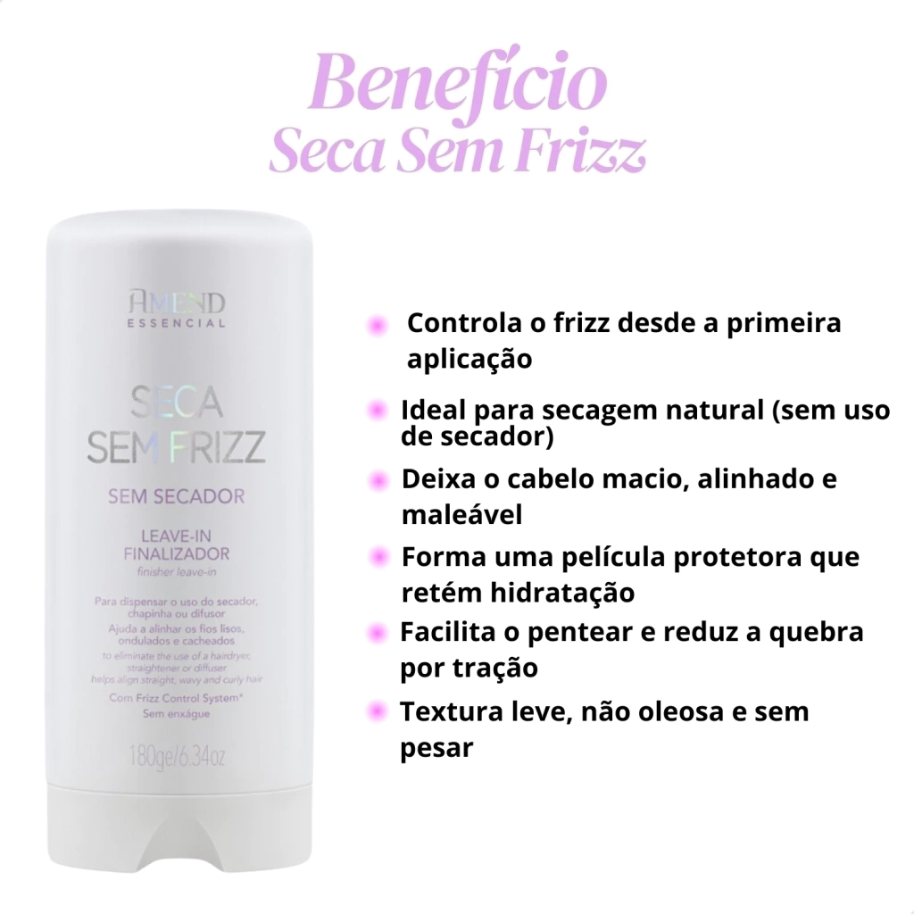 O Leave-in Amend Essencial Seca Sem Frizz foi desenvolvido para quem deseja praticidade na finalização dos fios. A fórmula conta com o exclusivo Frizz Control System, que ajuda a alinhar as cutículas, minimizar o frizz e manter a hidratação, mesmo sem o uso de secador, chapinha ou difusor.