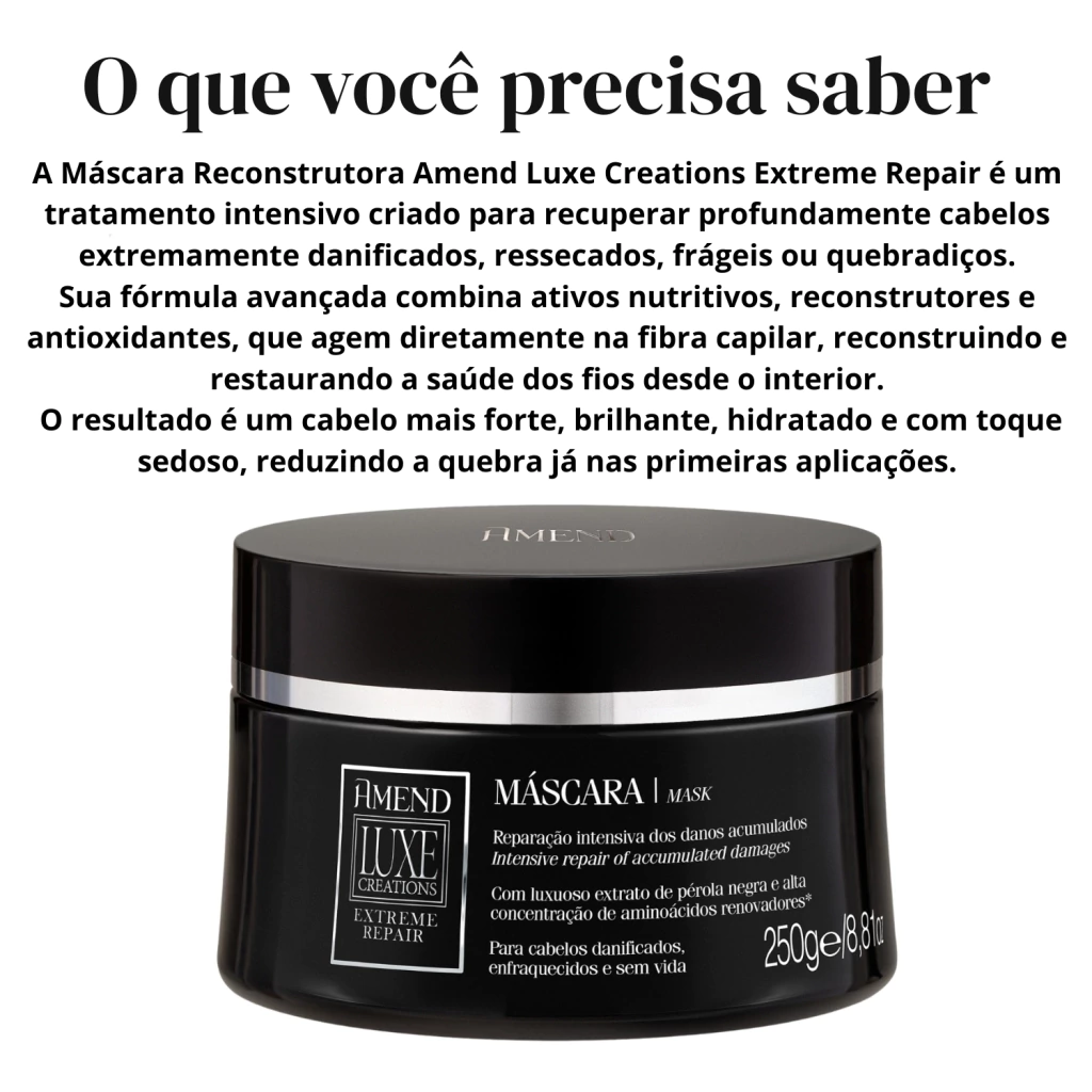 A Máscara Amend Luxe Creations Extreme Repair 250g é um tratamento premium de reparação intensa, desenvolvida para recuperar profundamente cabelos danificados e enfraquecidos desde a primeira aplicação.