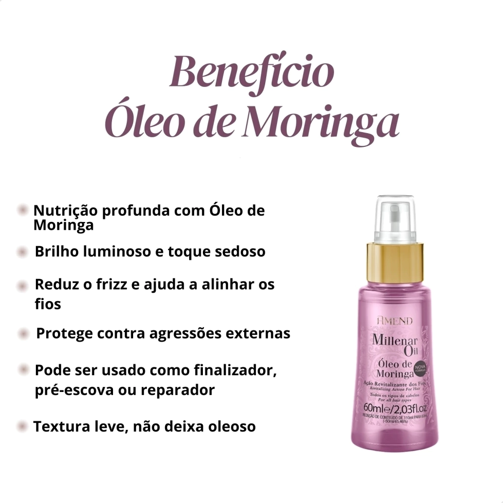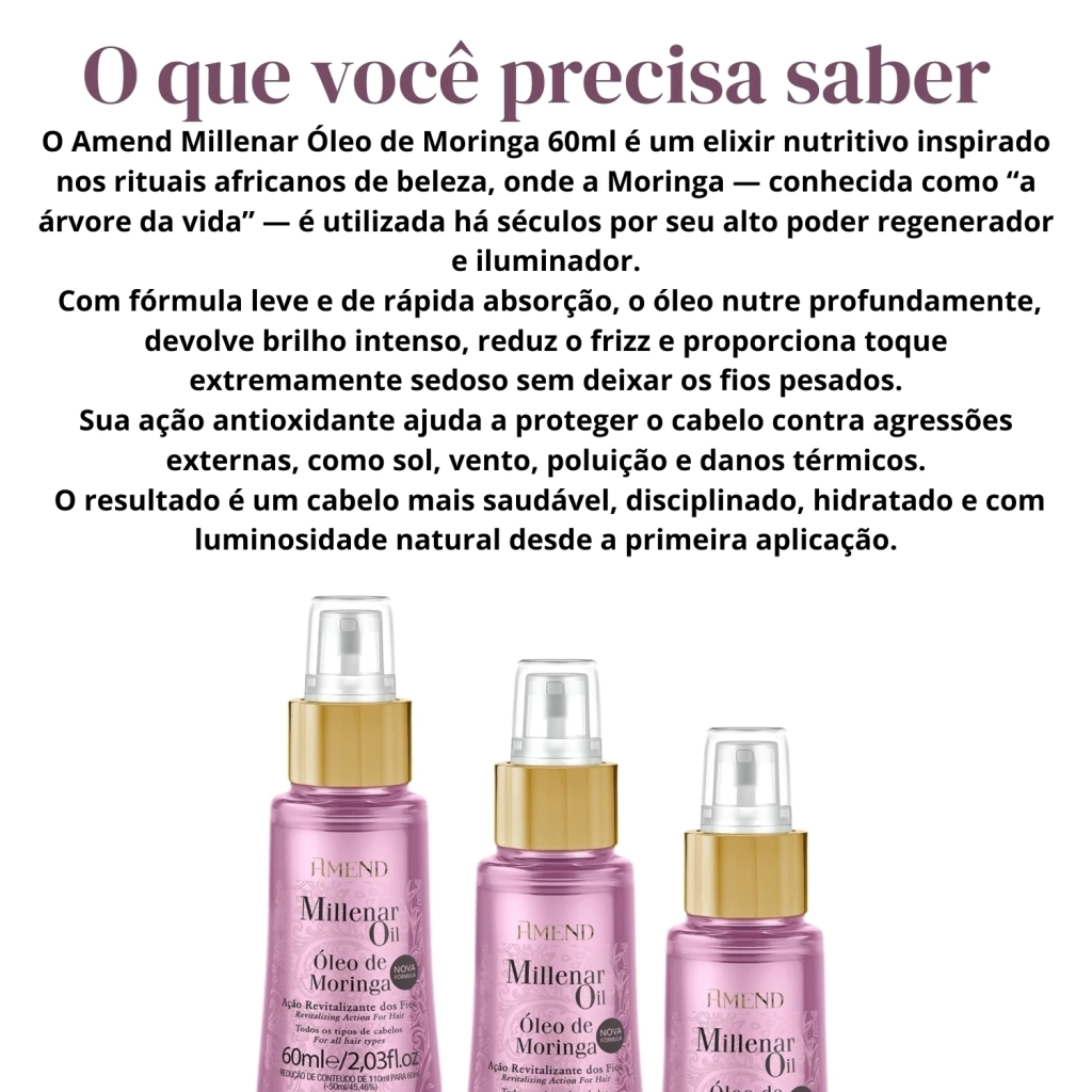 O Amend Millenar Óleo de Moringa é um elixir nutritivo inspirado nos rituais africanos de beleza, onde a Moringa — conhecida como “a árvore da vida” — é utilizada há séculos por seu poder regenerador, antioxidante e iluminador. Sua fórmula leve, de rápida absorção e rica em Óleo de Moringa promove nutrição profunda, brilho luminoso, toque sedoso e redução imediata do frizz, sem pesar ou deixar resíduos oleosos. O óleo ainda cria um escudo protetor contra agressões externas como sol, vento, poluição e danos térmicos, mantendo a fibra capilar saudável e equilibrada.