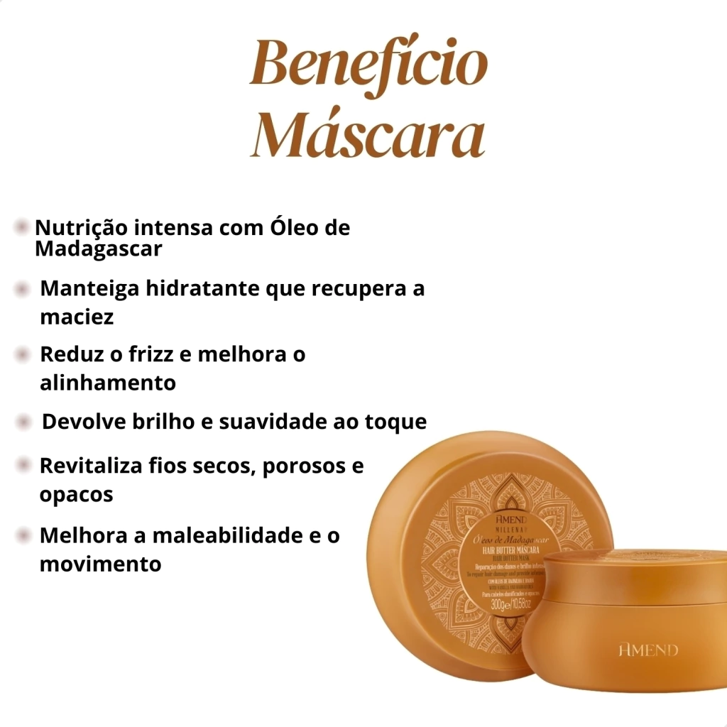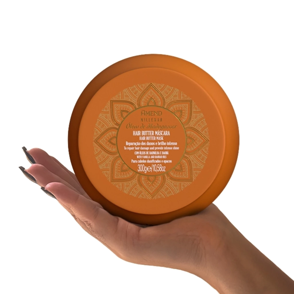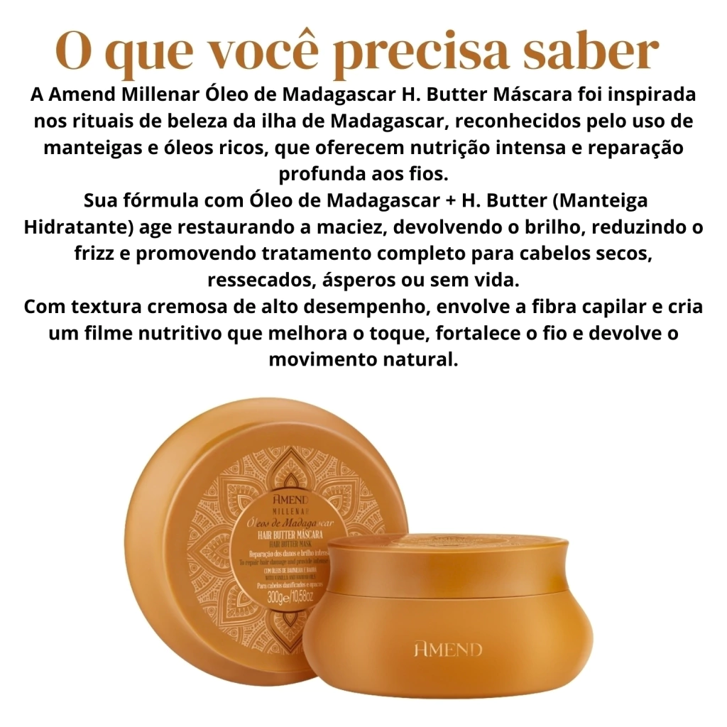 A Máscara Amend Millenar Óleo de Madagascar Hair Butter foi inspirada nos antigos rituais de beleza da ilha de Madagascar, conhecidos pelo uso de manteigas e óleos ricos que restauram profundamente os fios.