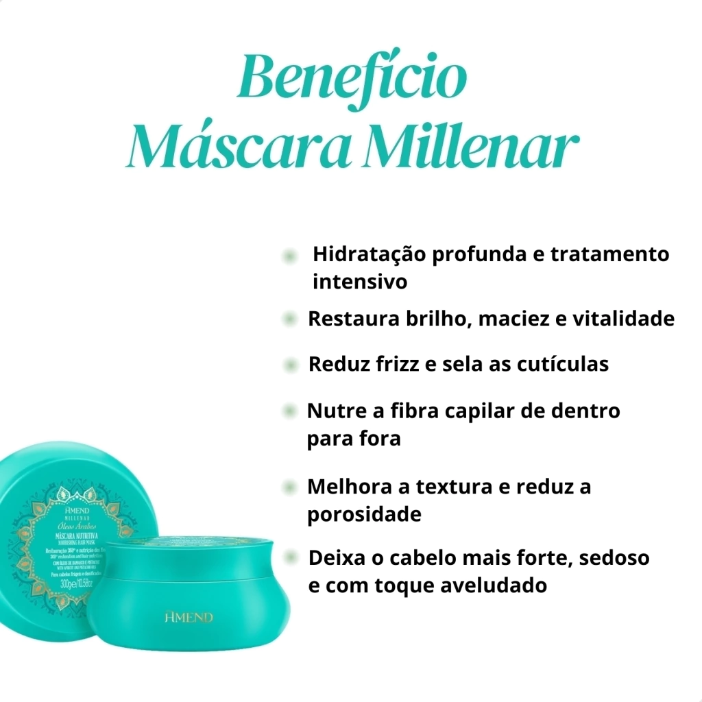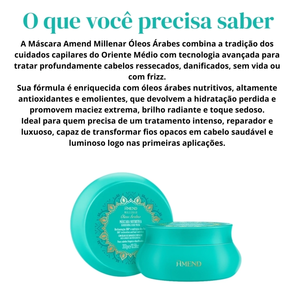 Cabelos secos, opacos, ressecados ou com frizz exigem um tratamento profundo, nutritivo e luxuoso — exatamente o que a Máscara Amend Millenar Óleos Árabes 300g oferece.