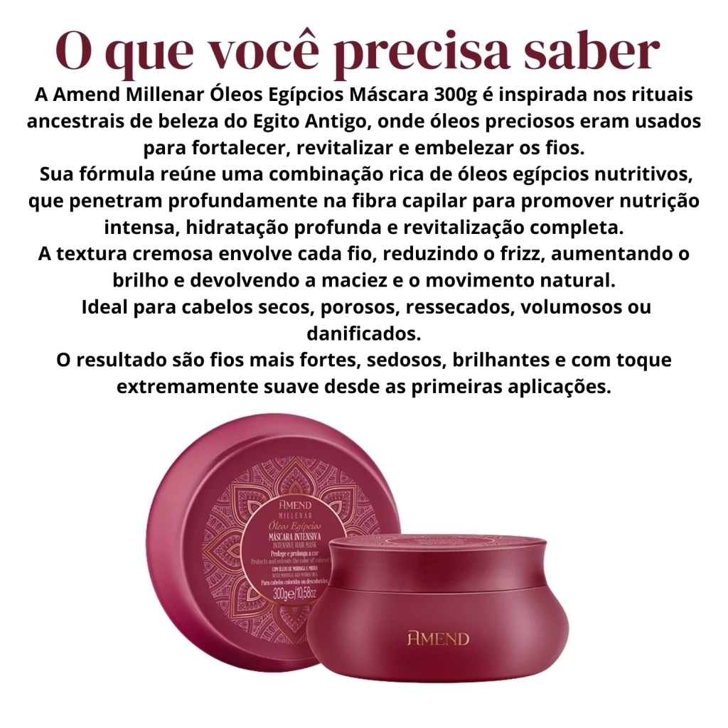 Fios secos, porosos, ressecados, volumosos ou danificados pedem um tratamento realmente poderoso — e é exatamente isso que a Máscara Amend Millenar Óleos Egípcios 300g oferece.