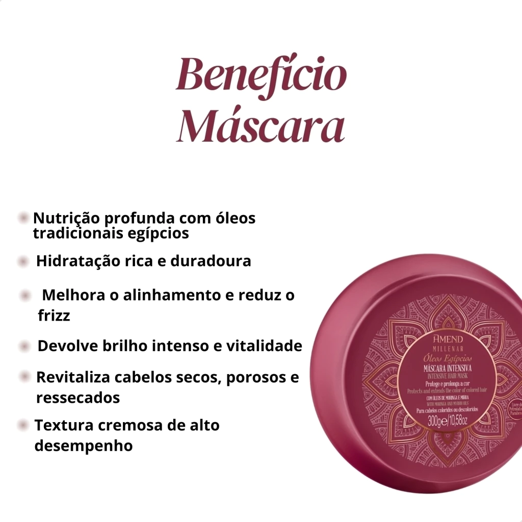 Sua fórmula reúne óleos egípcios nutritivos que penetram profundamente na fibra, promovendo hidratação intensa, nutrição rica, revitalização completa e devolvendo o brilho natural.