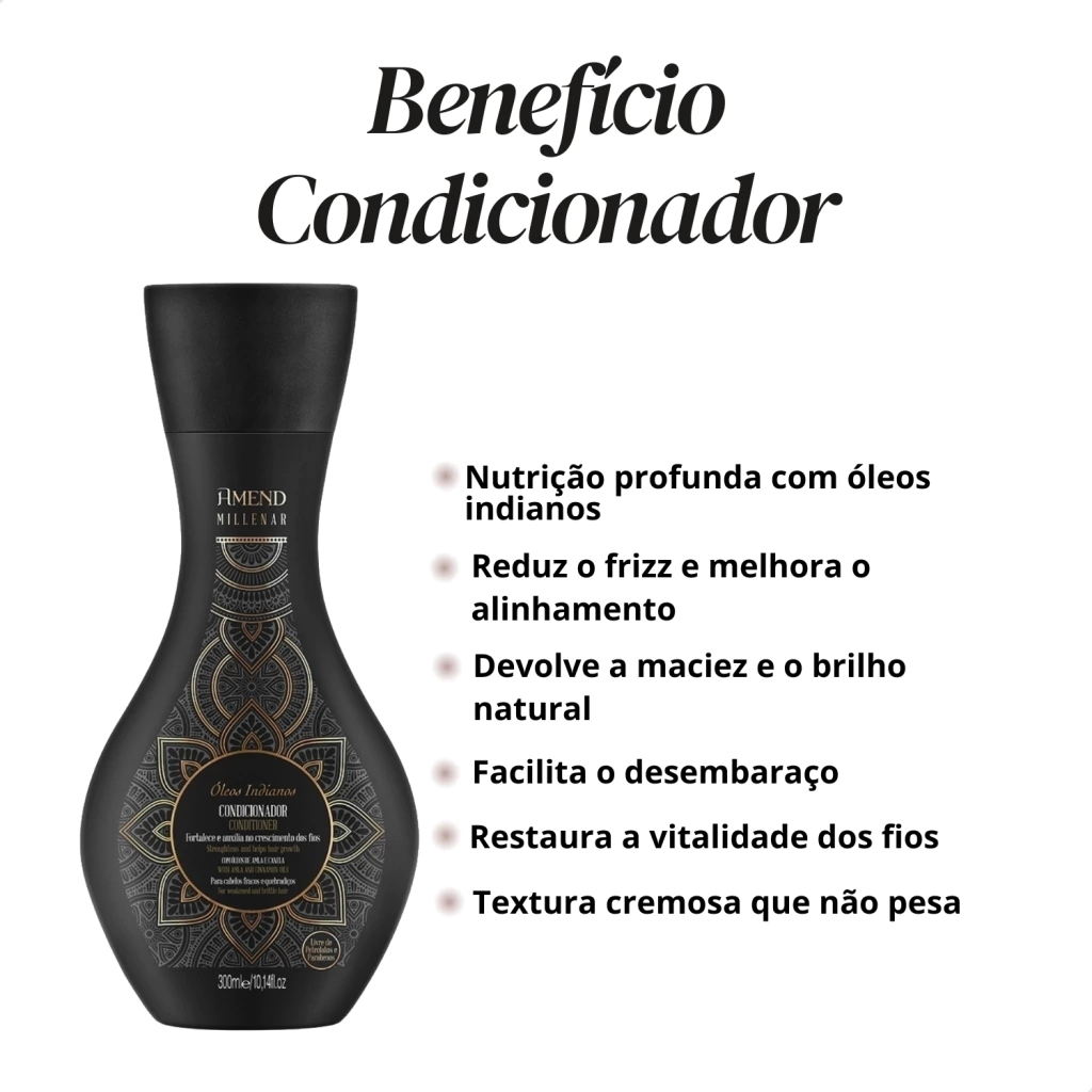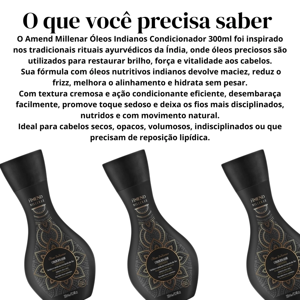 O Amend Millenar Óleos Indianos Condicionador 300ml é inspirado nos tradicionais rituais ayurvédicos da Índia, onde óleos preciosos são utilizados há séculos para restaurar força, brilho e vitalidade aos cabelos.