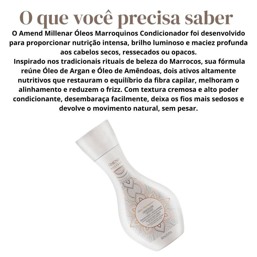 A tradição milenar do Marrocos chega para transformar a experiência de cuidado dos fios. O Condicionador Amend Millenar Óleos Marroquinos 300ml oferece um condicionamento profundamente nutritivo, que recupera a maciez, a elasticidade e a hidratação natural dos cabelos ressecados.