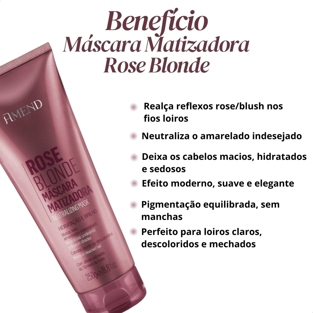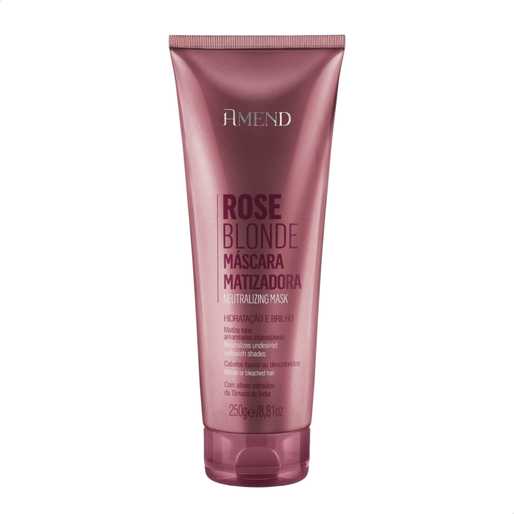 A Amend Rose Blonde Máscara Matizadora 250g foi criada para quem deseja neutralizar tons amarelados e revelar reflexos rose sofisticados enquanto trata profundamente a fibra capilar.