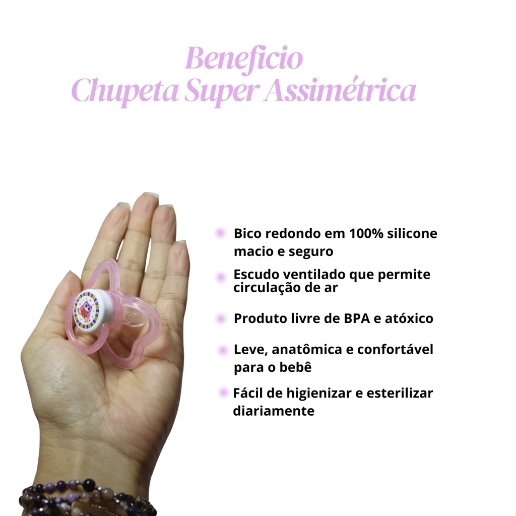 A Chupeta Super Assimétrica Ninet Rosa foi desenvolvida para oferecer conforto e segurança ao bebê, auxiliando no desenvolvimento oral de forma saudável.
