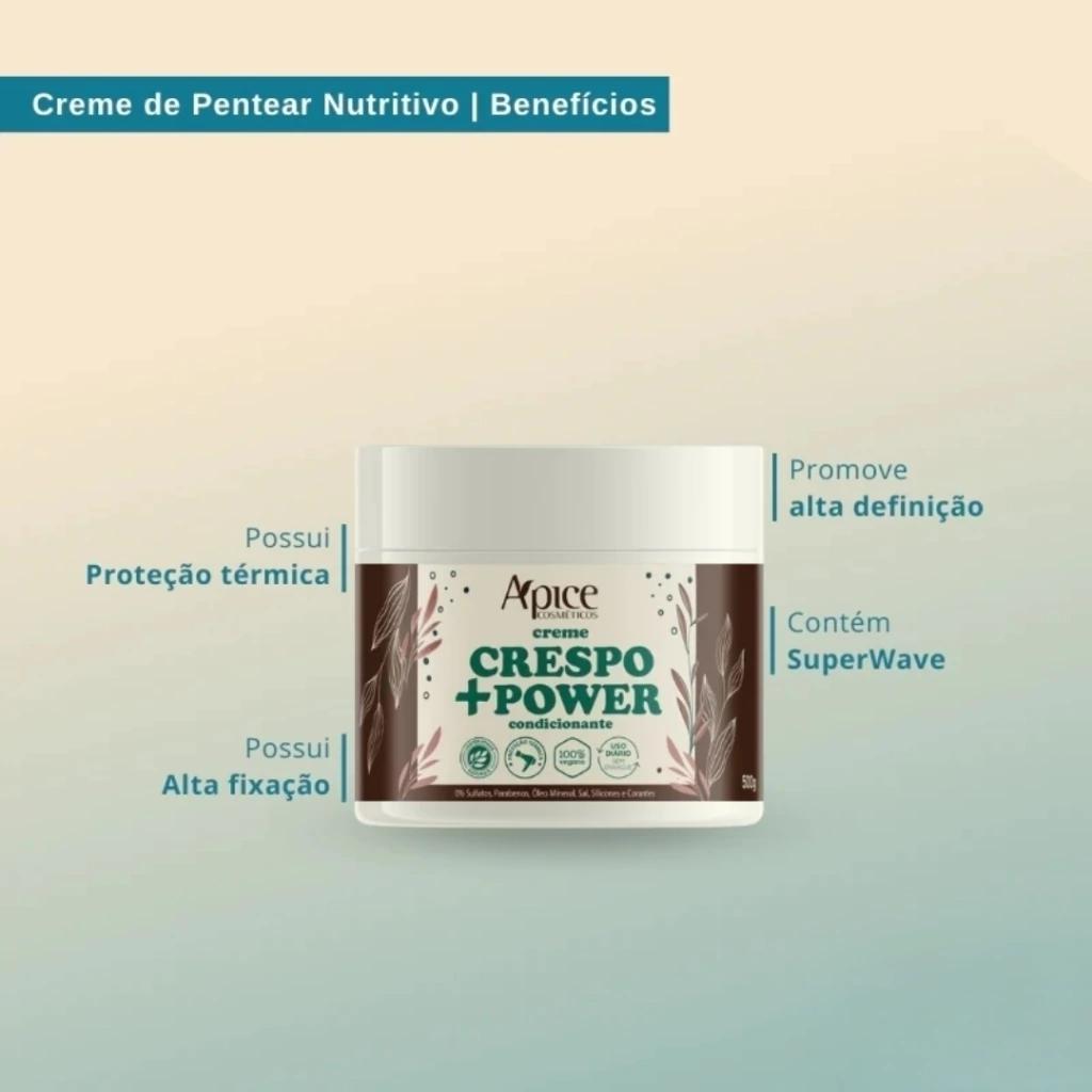 O creme Crespo + Power é ideal para crespas tipo 4, que buscam alta definição e fixação em suas finalizações.