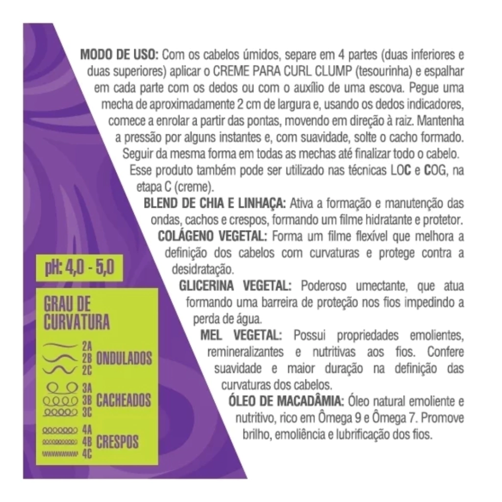 MODO DE USO: Com os cabelos úmidos, separe em 4 partes (duas inferiores e duas superiores) aplicar o CREME PARA CURL CLUMP (tesourinha) e espalhar em cada parte com os dedos ou com o auxílio de uma escova. Pegue uma mecha de aproximadamente 2 cm de largura e, usando os dedos indicadores, comece a enrolar a partir das pontas, movendo em direção à raiz. Mantenha a pressão por alguns instantes e, com suavidade, solte o cacho formado. Seguir da mesma forma em todas as mechas até finalizar todo o cabelo.