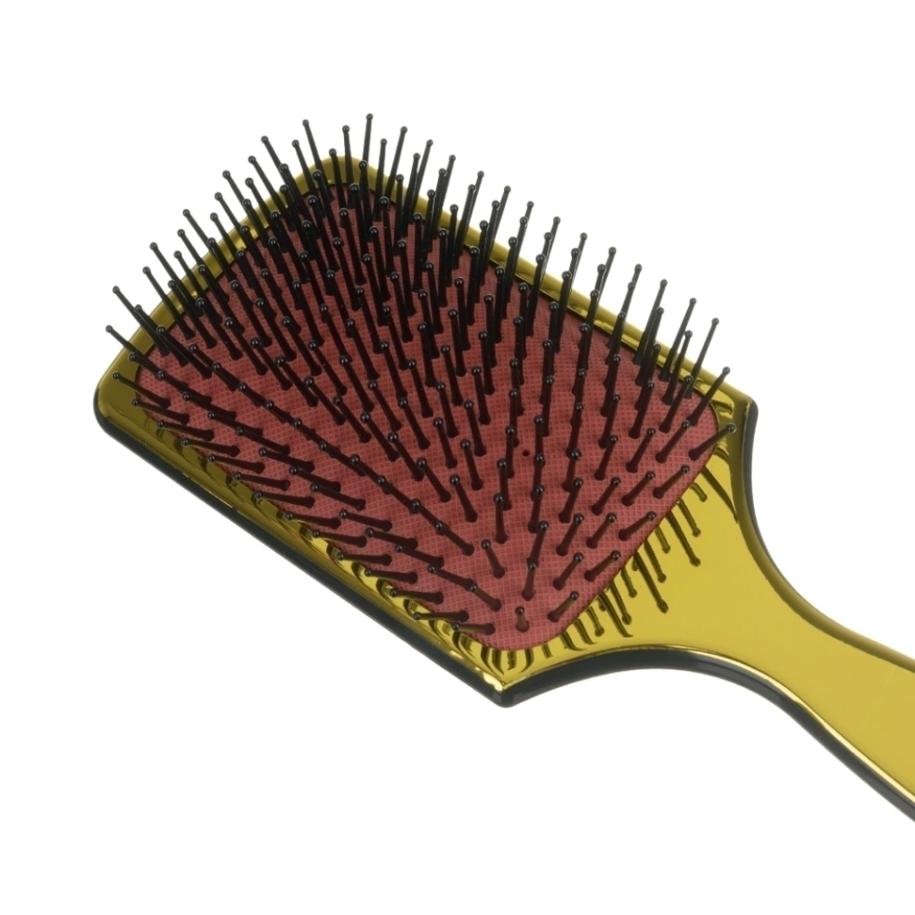 Escova almofadada ultra soft com cerdas de nylom e acabamento metallic gold, ideal para pentear e desembaraçar delicadamente todos os tipos de cabelo. Leve e ergonômica, massageia o couro cabeludo e estimula o crescimento saudável do fio reduzindo a queda de cabelo.