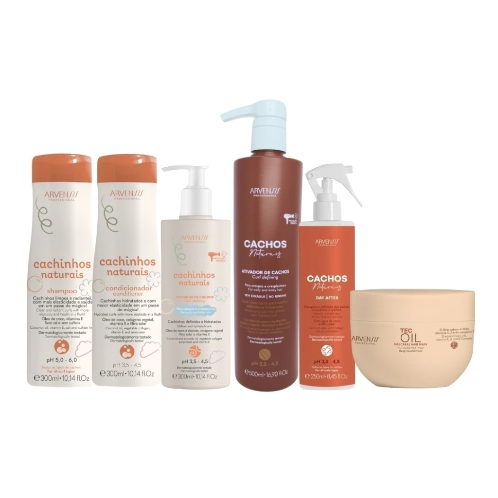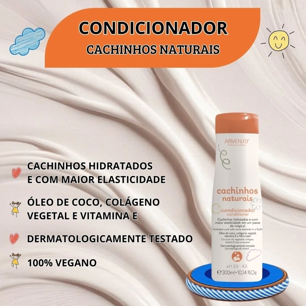 O Condicionador Cachinhos Naturais é ideal para o tratamento de todos os tipos de cabelos cacheados, proporcionando inúmeros benefícios como nutrição avançada, reparação dos fios danificados, condicionamento equilibrado, maciez, brilho e controle do frizz. (300mL) - pH 3,5 - 4,5 (LOW POO)