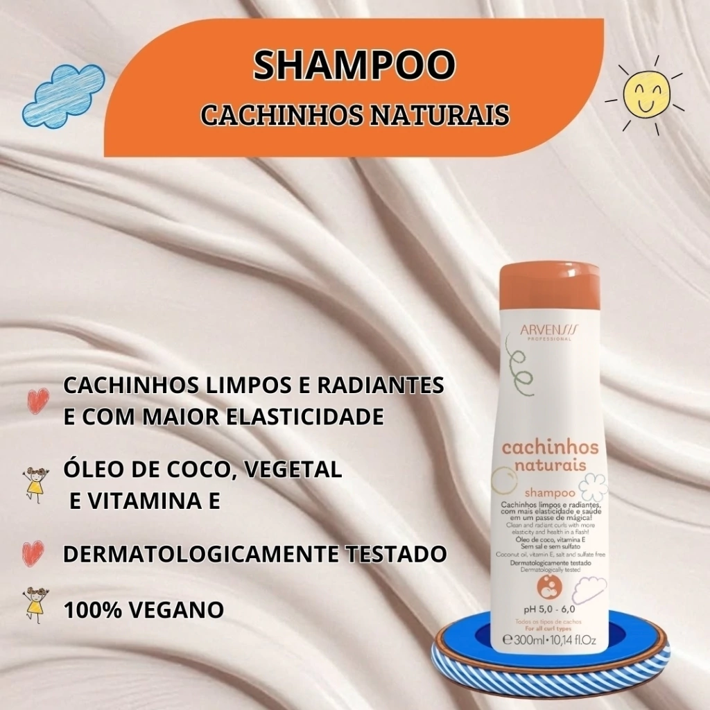 Desenvolvido com uma formulação livre de sulfato e de sal, o shampoo Cachinhos Naturais é especial para a limpeza suave de todos os tipos de cabelos cacheados. (300mL) - Sem Sal - pH 5,0 - 6,0 (LOW POO)