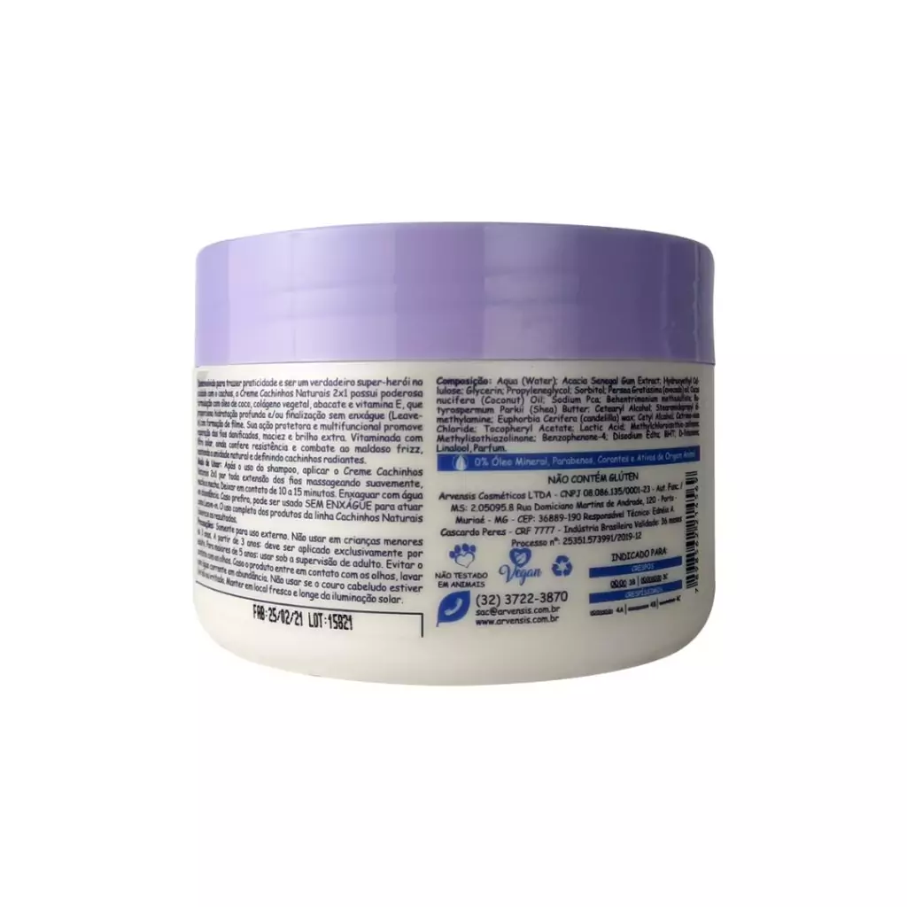 Desenvolvido para atuar como hidratante e finalizador de cabelos crespos e crespíssimos, o Creme Cachinhos Naturais 2X1 possui ação protetora e multifuncional - conferindo resistência, formação de filme e controle de frizz, além de manter a umidade natural e definir cachos nutridos radiantes. Contém filtro solar. (250g) - pH 3,5 - 4,5 (NO POO)