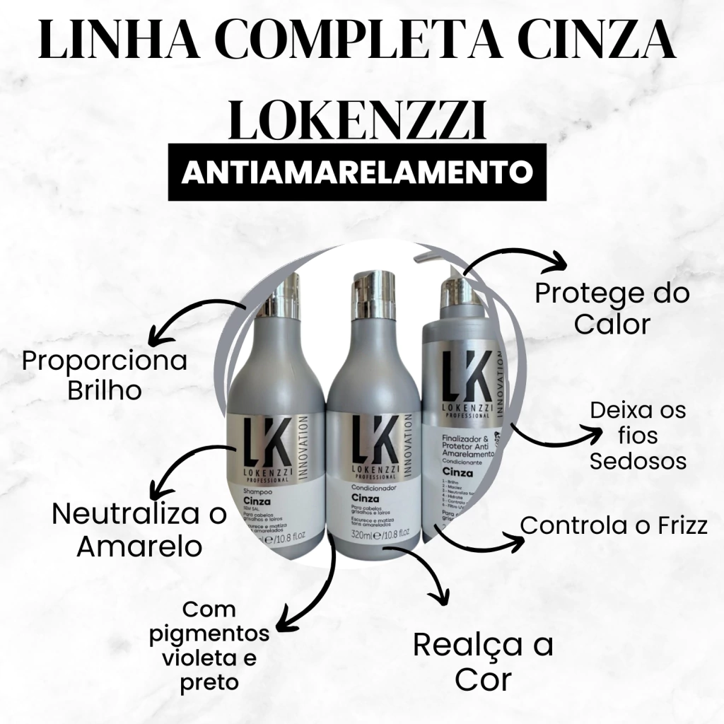 Após molhar os cabelos aplique o shampoo por todo o cabelo. Deixe de 3 a 5 minutos e enxágue. Para melhores resultados use também o Condicionador Cinza Lokenzzi.