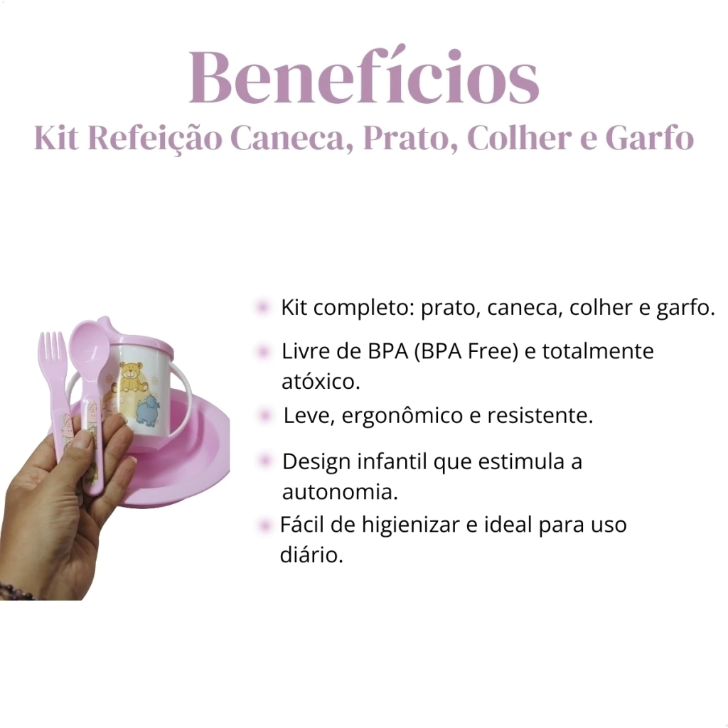 Com utensílios leves, ergonômicos e resistentes, o kit ajuda no aprendizado, estimula a autonomia e transforma cada refeição em um momento especial.