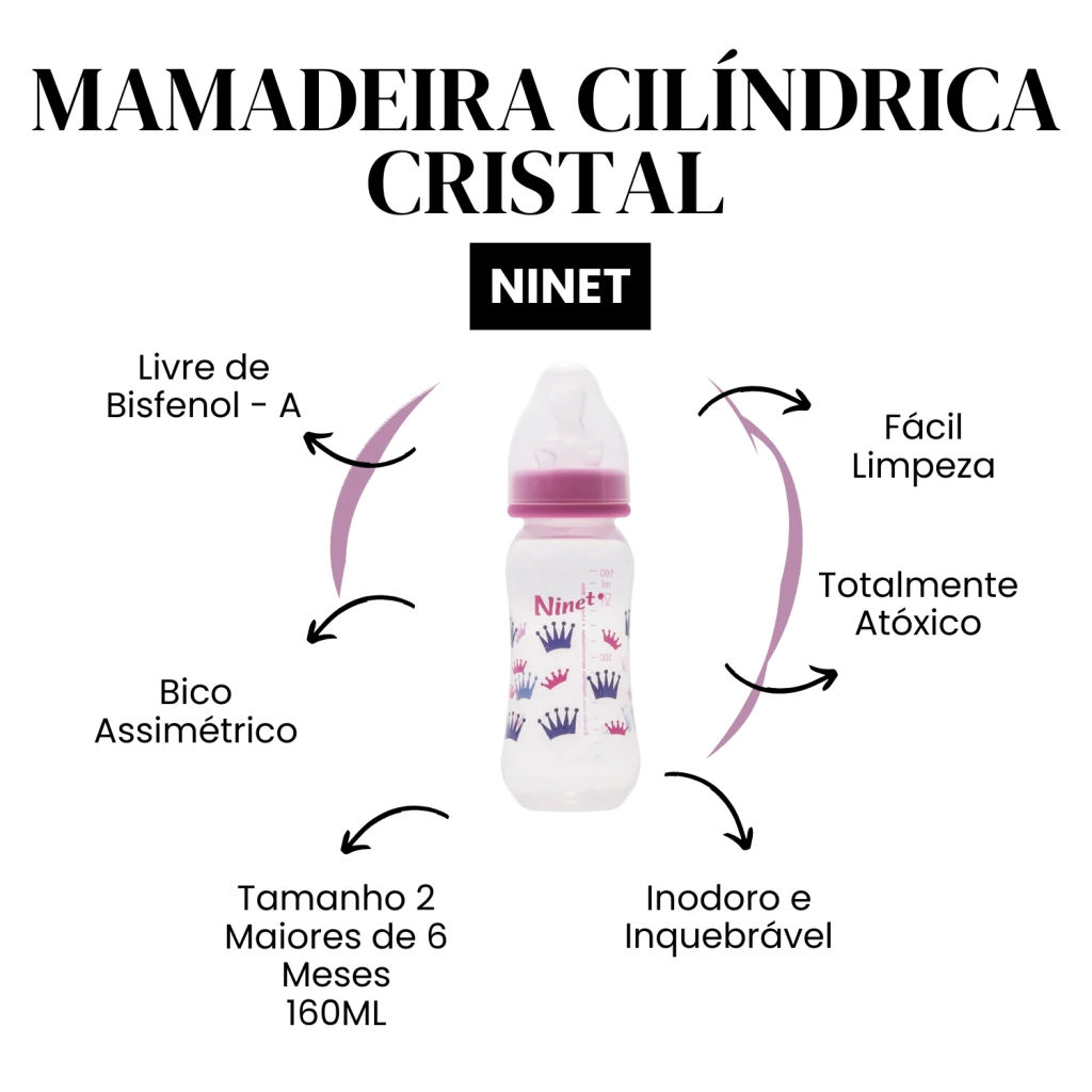 A Mamadeira Ninet Acinturada Cristal Rosa 160ml REF 559 foi desenvolvida para trazer segurança, praticidade e conforto às mamadas do seu bebê.