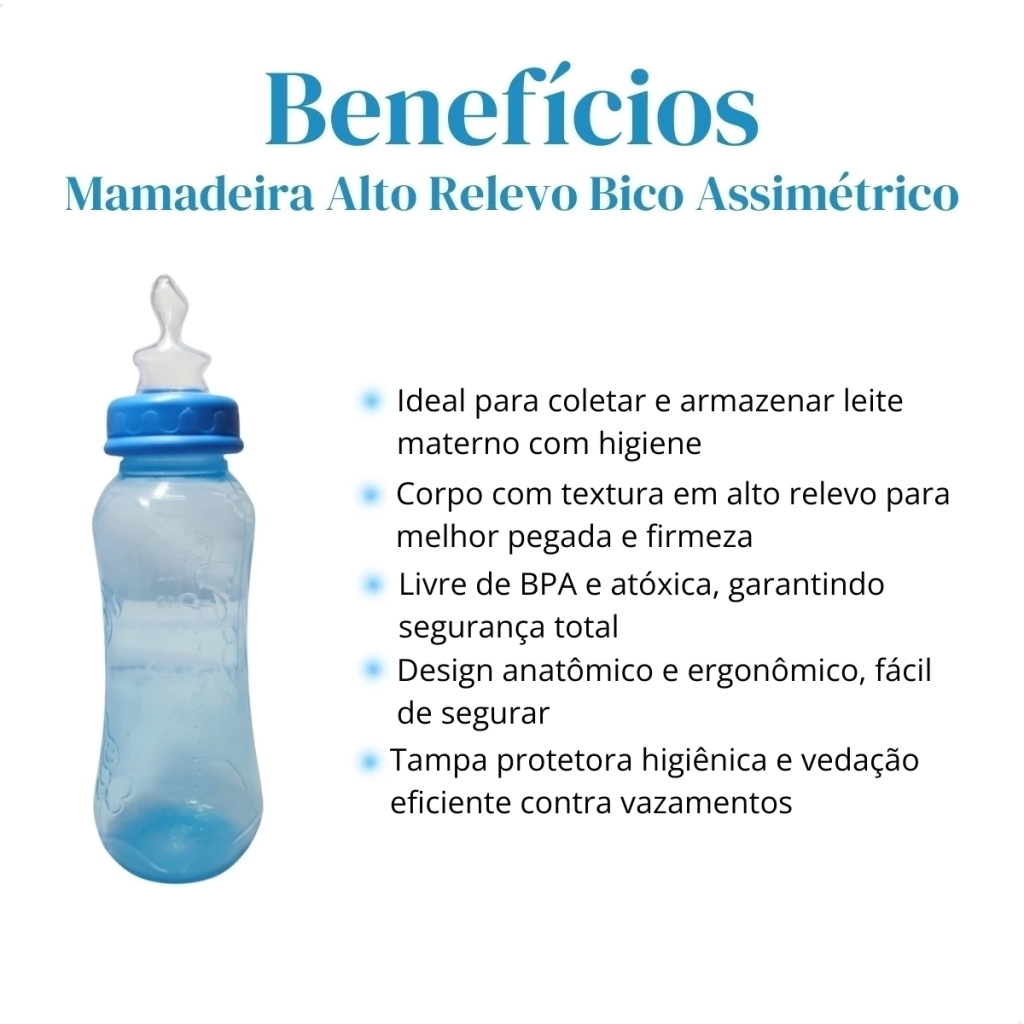 Seu design anatômico e textura em alto relevo oferecem firmeza e melhor pegada, tornando o momento da mamada mais seguro e agradável.
