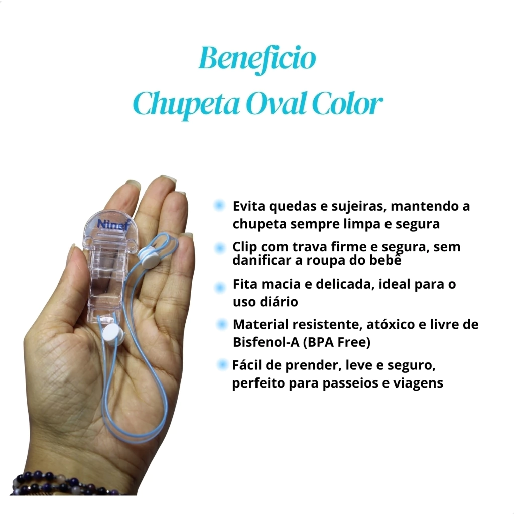 O Prendedor de Chupeta NINET foi especialmente desenvolvido para proporcionar mais praticidade e segurança no dia a dia do bebê. Sua função é evitar que a chupeta caia no chão ou se perca, garantindo maior higiene e conforto.