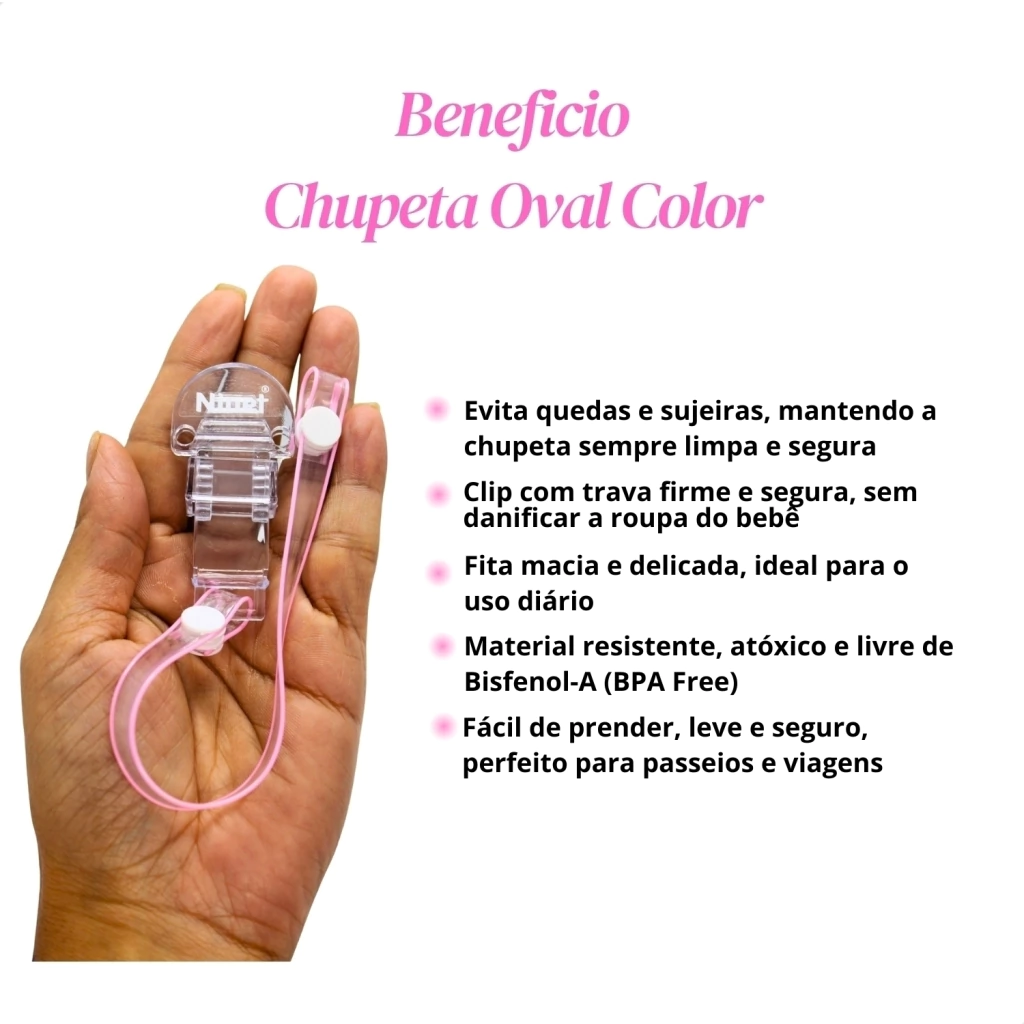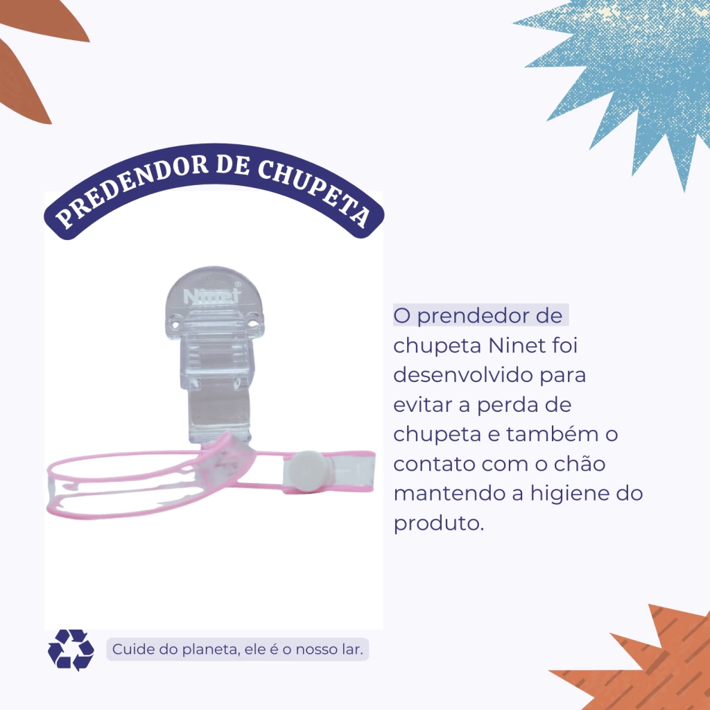 O Prendedor de Chupeta NINET foi especialmente desenvolvido para proporcionar mais praticidade e segurança no dia a dia do bebê. Sua função é evitar que a chupeta caia no chão ou se perca, garantindo maior higiene e conforto.