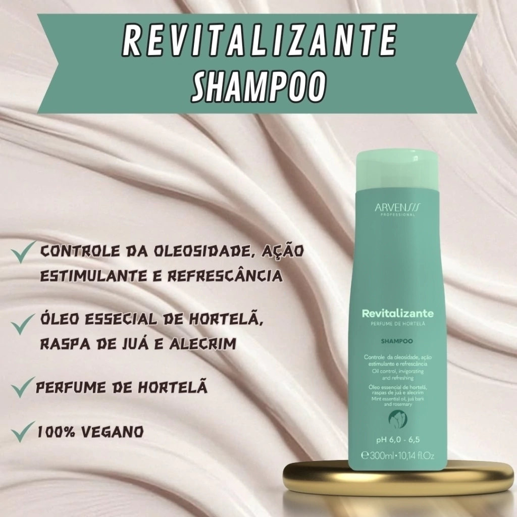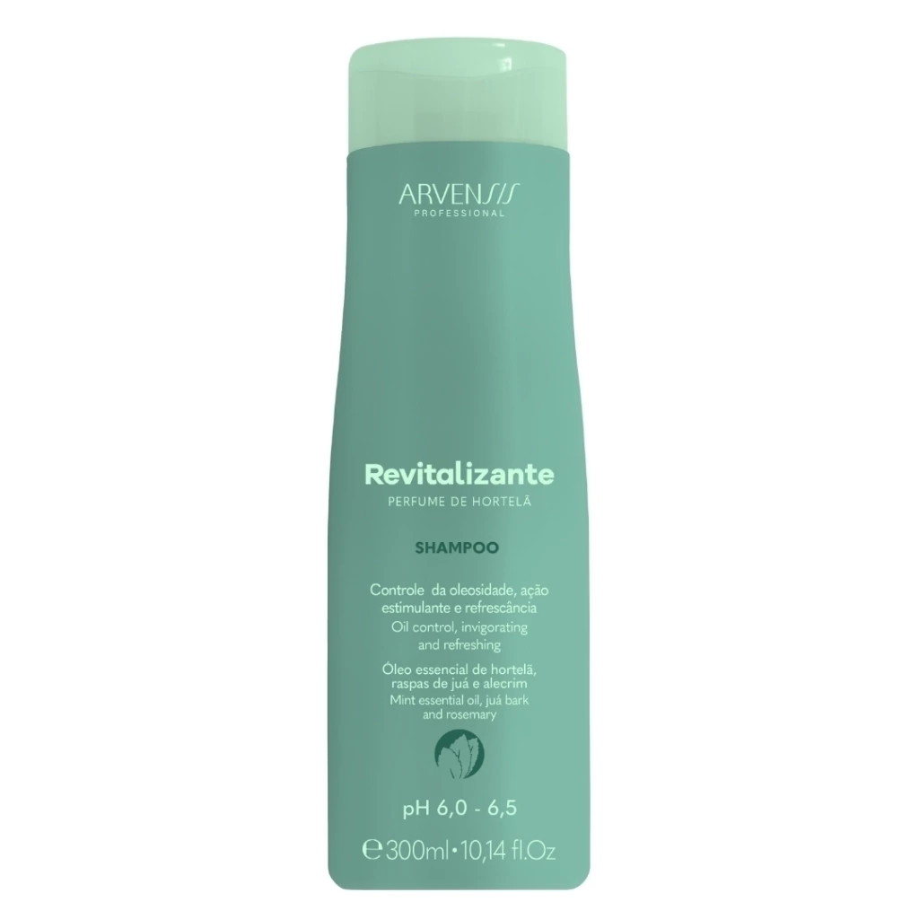 O Shampoo Revitalizante ativa e oxigena o couro cabeludo, fortalecendo o folículo piloso, reduzindo a queda e promovendo alta sensação de refrescância. (300 mL) - Sem Sal - pH 6,0 - 6,5