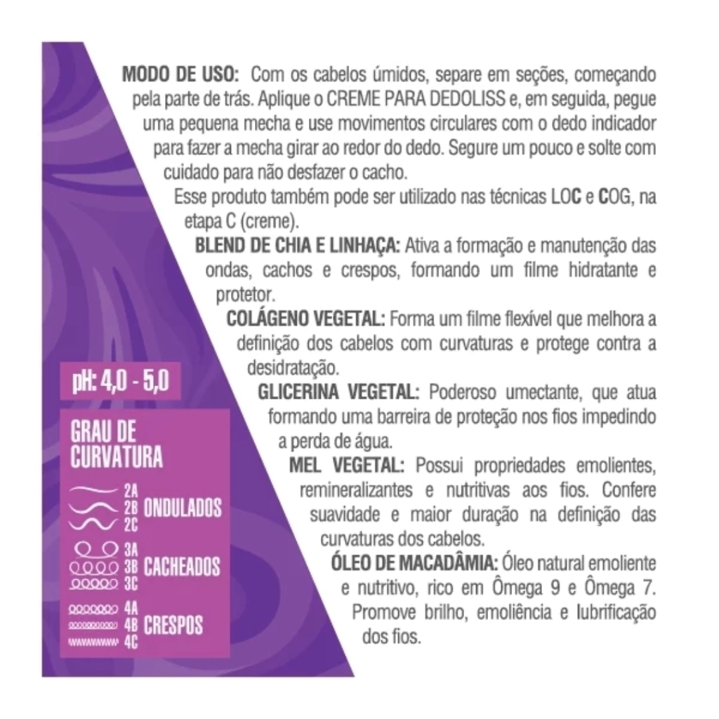 MODO DE USO: Com os cabelos úmidos, separe em seções, começando pela parte de trás. Aplique o CREME PARA DEDOLISS e, em seguida, pegue uma pequena mecha e use movimentos circulares com o dedo indicador para fazer a mecha girar ao redor do dedo. Segure um pouco e solte com cuidado para não desfazer o cacho.